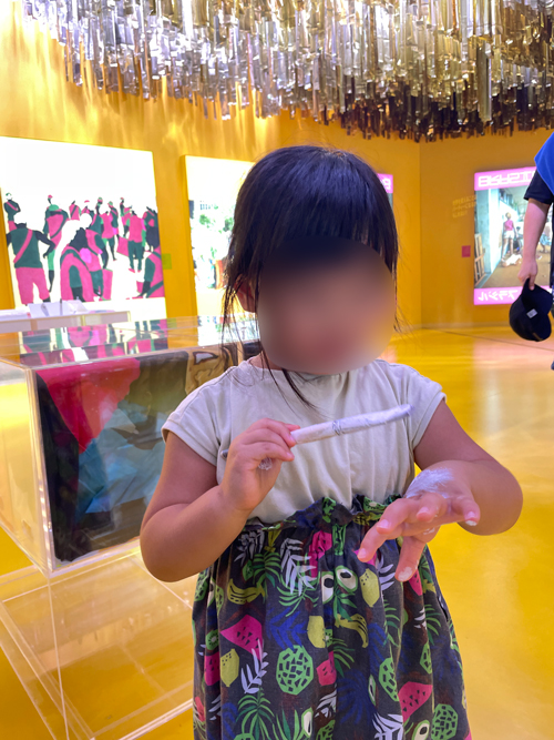 さらに奥には、手や顔に先住民風のペイントができるコーナーもあり、水性塗料なので気軽に楽しめます。色鮮やかな展示と相まって、写真映えする空間になっています。