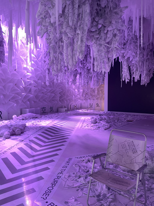 ポンチョだけじゃないのがブラジル館の魅力。館内に入ると、まず現れるのは白い布で作られたオブジェが並ぶアート空間。抽象的なメッセージが書かれた展示と相まって、現代アートのような雰囲気に。