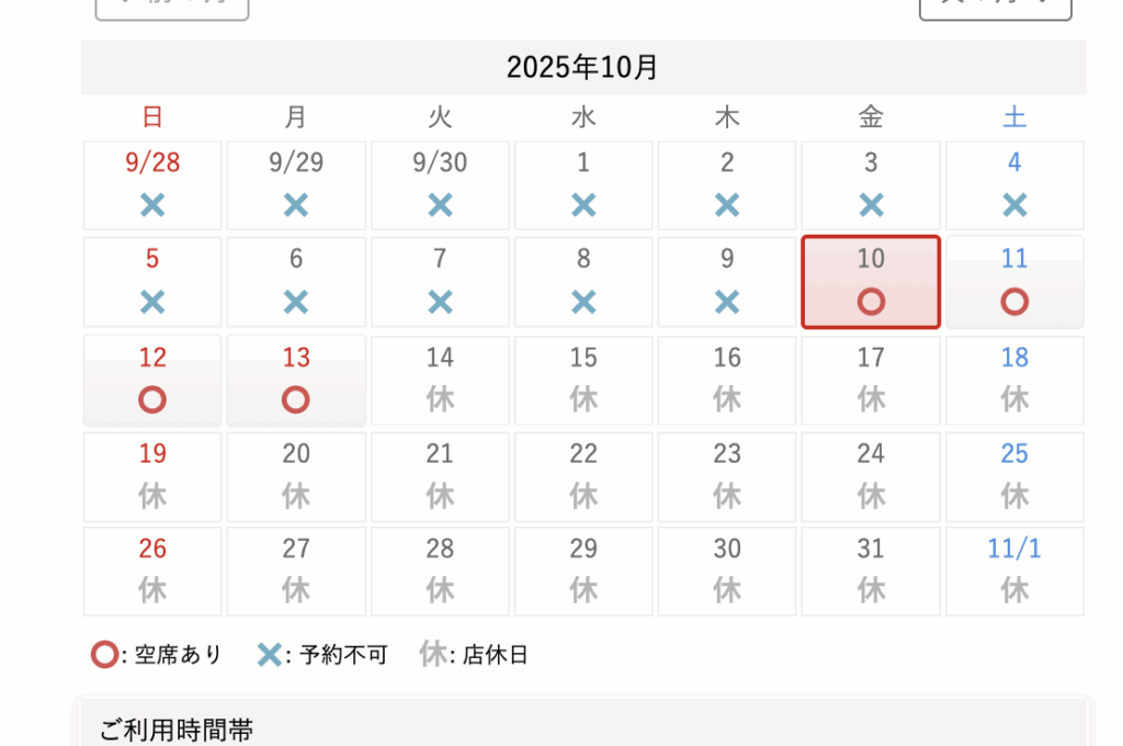 キャンセルは3日前までで、日中の枠がすでに埋まっていることが多いですが、直前や3日前後のタイミングでキャンセルが出ることもあるため、こまめにチェックするのがおすすめです。