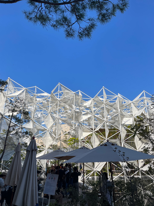 まず目を引くのは外観デザイン。2020年ドバイ万博の日本館で使われた組子ファサードを再利用しており、考案したのは建築家・永山祐子氏。江戸切子のような繊細な模様が美しく、再利用によるサステナブルな設計も特徴です。