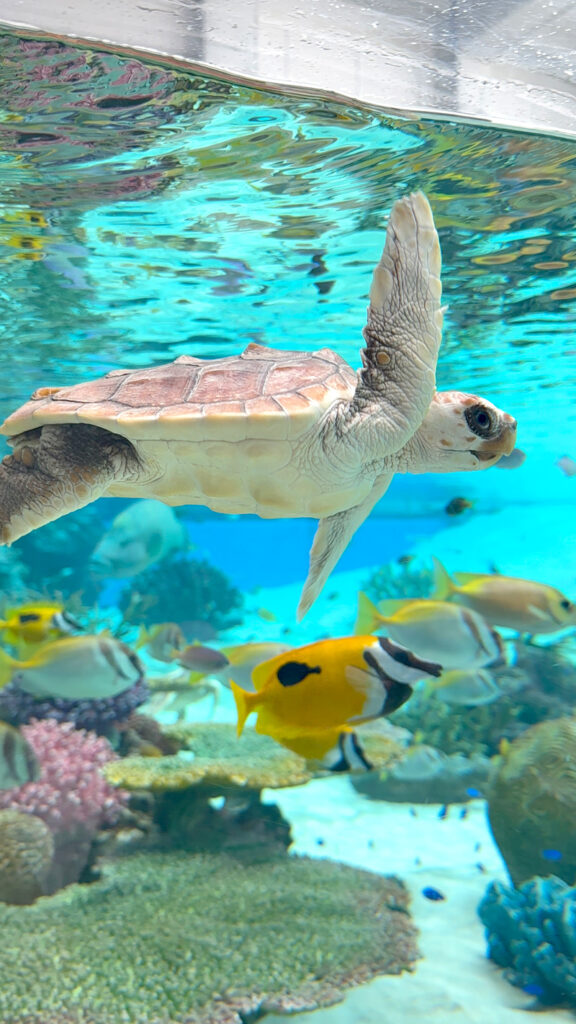 トップライトから自然光が差し込み、本物のヤシの木が育つ中、珊瑚礁の自然環境を忠実に再現したエリア。透き通ったターコイズブルーの水の中を、ウミガメの赤ちゃんがひらひらと泳ぐ姿は、思わず足が止まってしまうほど可愛くて綺麗です。