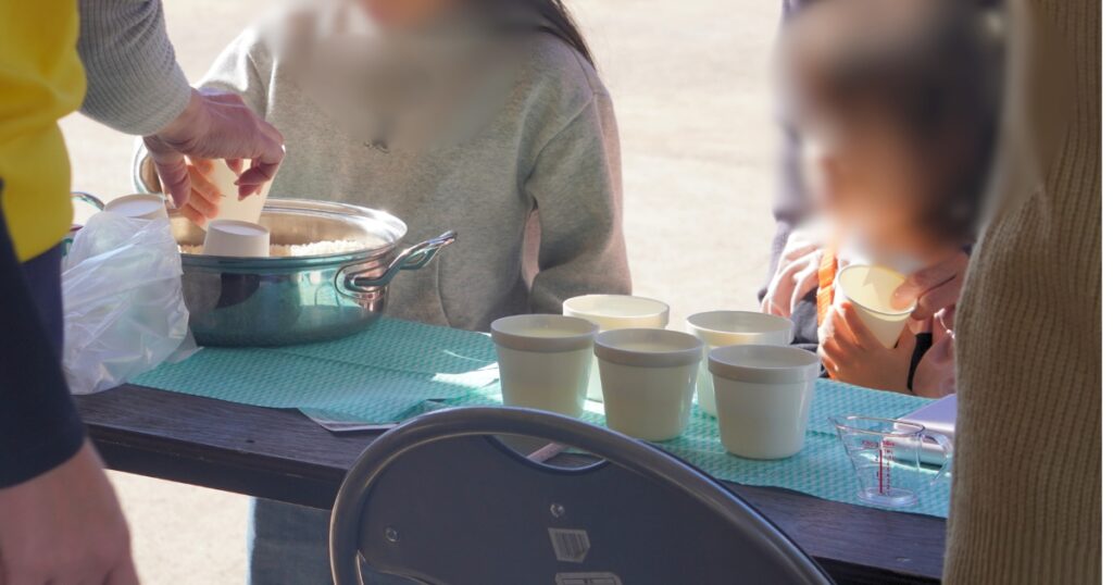 お鍋の前で子どもたちが真剣にコップをのぞき込み、そっとお米を入れていく様子が印象的でした。少し時間が経ってから戻ってくると、炊き上がったご飯は袋のままそのまま受け取れて、最後に塩をまぶしておにぎりに。