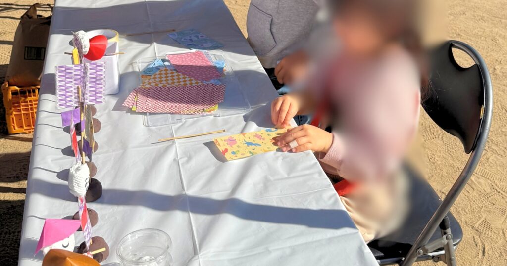 テーブルでの作業は子どもたちも夢中で、同じ材料でもそれぞれ個性が出るのが面白かったです。会場のあいな里山公園には本物のかかしもたくさん並んでいたので、実際の景色とリンクしながら作れるのが良い経験になりました。