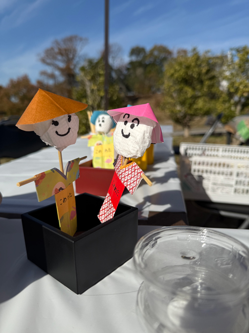 次はクラフト体験。小さな紙人形に色紙で着物を着せたり、帽子をつけたりして、かわいい“かかし風のミニ人形”を作りました。